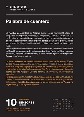 El próximo miércoles 10 no habrán cuentos en la tetería de Otman. Pero se debe a un caso excepcional. Y es que ese día todos los cuenteros de Barcelona queremos estar a las 20h en la Casa de América, para asistir la presentación del libro Palabra de cuentero, de Nicolás Buenaventura Vidal, un libro del que ya os he hablado antes aquí.
