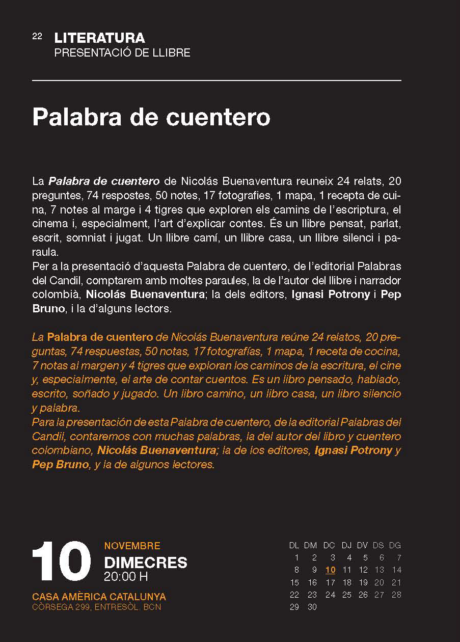 El próximo miércoles 10 no habrán cuentos en la tetería de Otman. Pero se debe a un caso excepcional. Y es que ese día todos los cuenteros de Barcelona queremos estar a las 20h en la Casa de América, para asistir la presentación del libro Palabra de cuentero, de Nicolás Buenaventura Vidal, un libro del que ya os he hablado antes aquí.