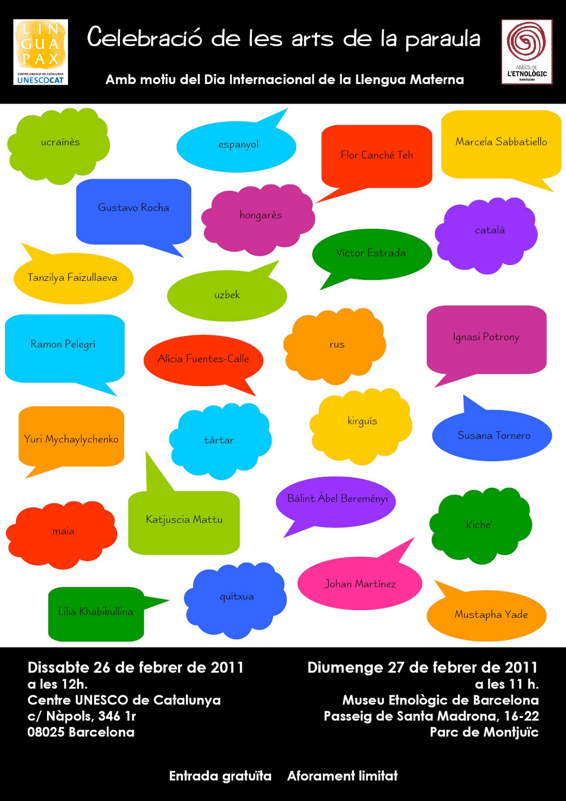 Amb ells estic preparant el meu granet de sorra per al Dia de la Llengua Materna, a través de COM FUSIÓ, un grup de gent de diferents procedències sorgit de l’Associació d’Amics del Museu Etnològic, i del projecte Linguapax del Centre UNESCO de Catalunya. Quina sort, poder escoltar altres llengües, descobrir la seva melodia, les seves peculiaritats…