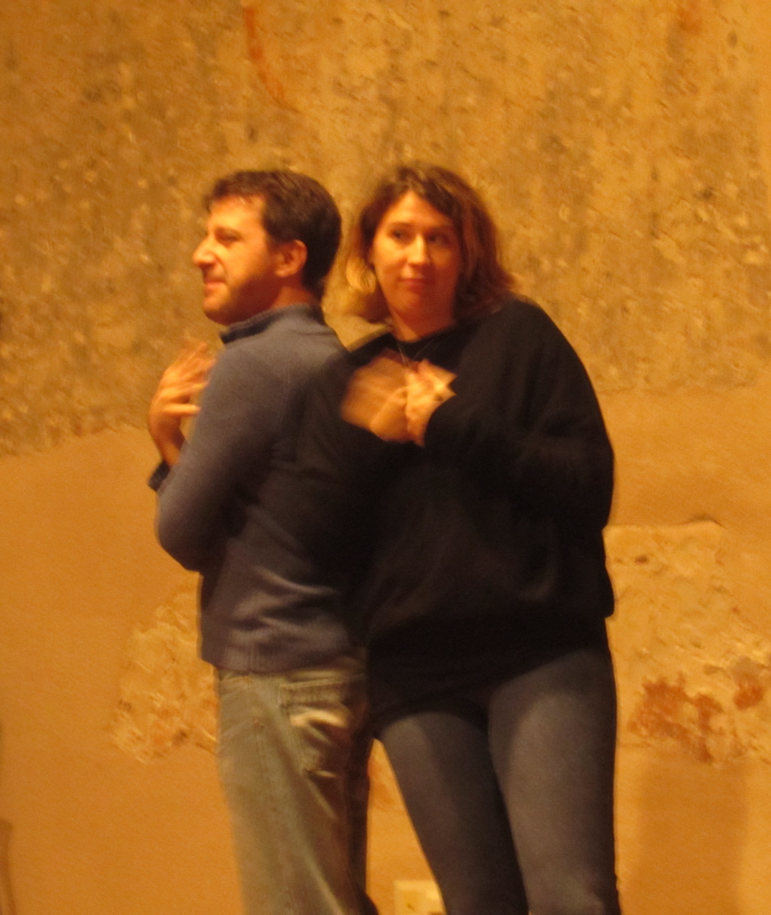Antonietta se encargó de las parejas: empezó realizando un calentamiento basado en ejercicios corporales (respiración conjunta, contagio de movimientos, espejo…) con las parejas de narración. Su propuesta busca que un narrador adopte el papel «traductor» del otro, procurando que la traducción pase a formar parte de la propuesta de narración. La propuesta permite también el juego o intercambio de roles, aunque debe prevalecer quién toma el papel de narrador y quién el de traductor.
