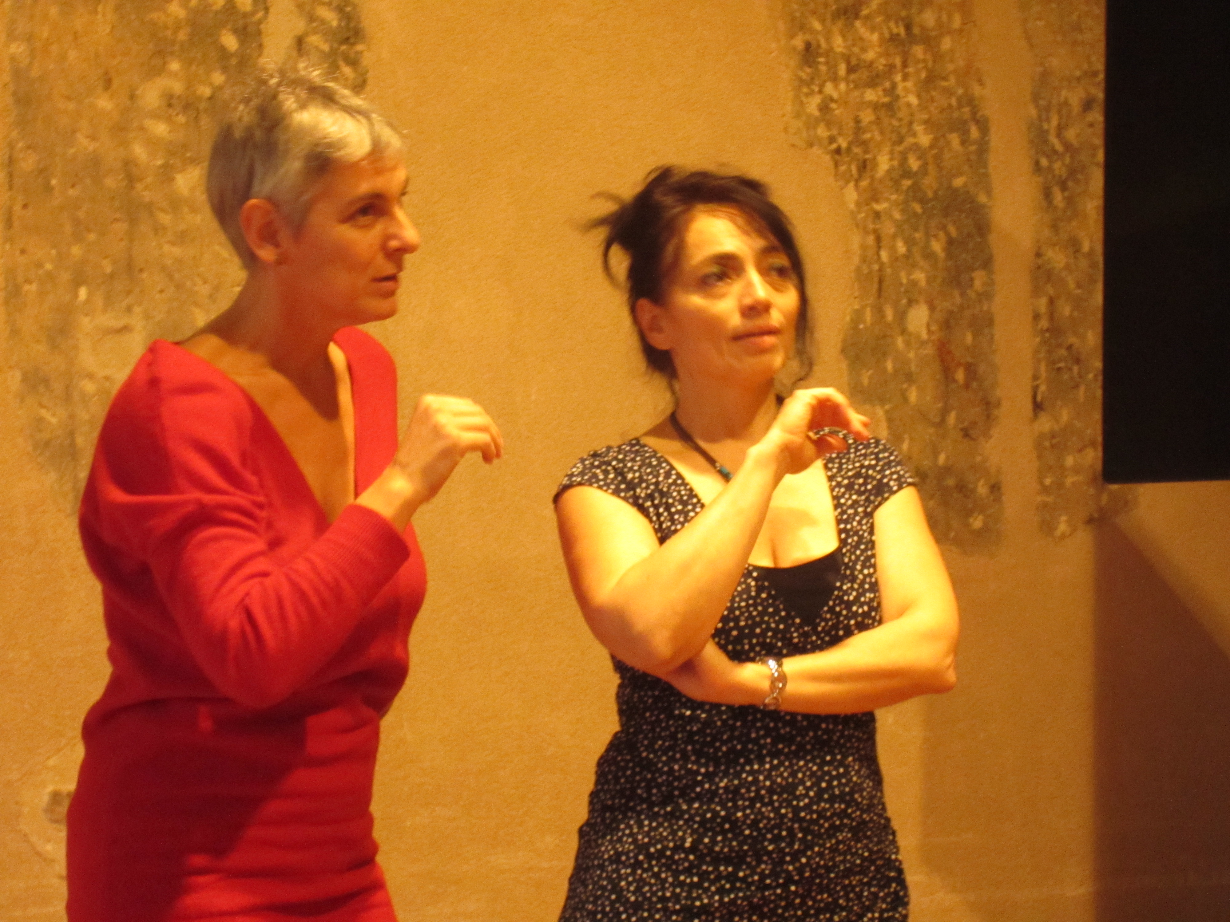 Le contre-masque est toujours efficace pour un effet comique. Deux énergies identiques donnent plus de poésie. Nous avons travaillé l’expression corporelle, la possession et l’occupation de l’espace. Les corps parlent et traduisent aussi pour faire comprendre au public. Nous avons vu comment la « chorégraphie » des déplacements peuvent nourrir l’histoire plutôt que d’enfermer l’imaginaire du public, il ne s’agit donc pas de mimer ou de répéter par le geste ou le déplacement ce qui est déjà dit. Nous avons travaillé en groupes de deux ou trois et nous est apparue la différence entre raconter la même histoire à plusieurs et en plusieurs langues et une histoire traduite par un autre narrateur, dans ce dernier cas le traducteur est au service de la narratrice. Pour arriver à une symbiose narratrice/traductrice, l’écoute est primordiale. L n’improvisation, la réactivité, la créativité en découlent.
