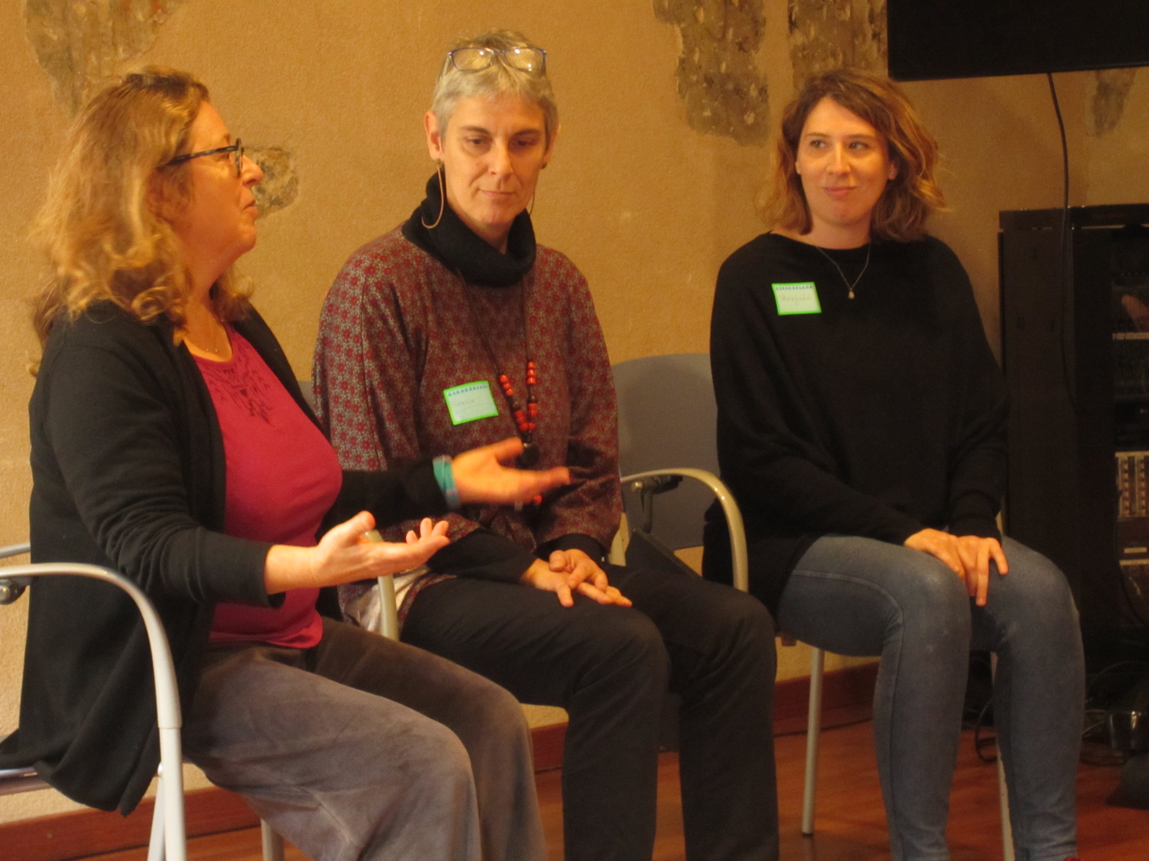«17 participants, 10 pays représentés, 8 langues, français, arabe, gun (du Bénin), galicien, catalan, espagnol, anglais, allemand. Nous avons travaillé par groupes de deux, trois ou quatre conteuses. Nous avons travaillé dans un premier temps à effacer les rôles entre narratrices et traductrice, pour arriver à un travail artistique incluant la traduction. Nous avons ensuite présenté les travaux au reste du groupe qui a fait des retours. Nous avons terminé par une table ronde ouverte au public du centre d’animation Pati Llimona qui nous accueillait. La bienveillance de tous et tous les participants, dans l’esprit des Actes Collectifs de l’APAC, a permis aux expérimentateurs de laisser libre cours à l’exploration et des propositions très différentes ont ainsi été présentées. Nous avons questionné la position de la conteuse et celle de la traductrice, rôles clairement distribuées ou glissement de l’un à l’autre, frontière invisible. Nous avons exploré les options de jeu, comment garder l’attention du public sans perdre l’esprit et essence du conte.