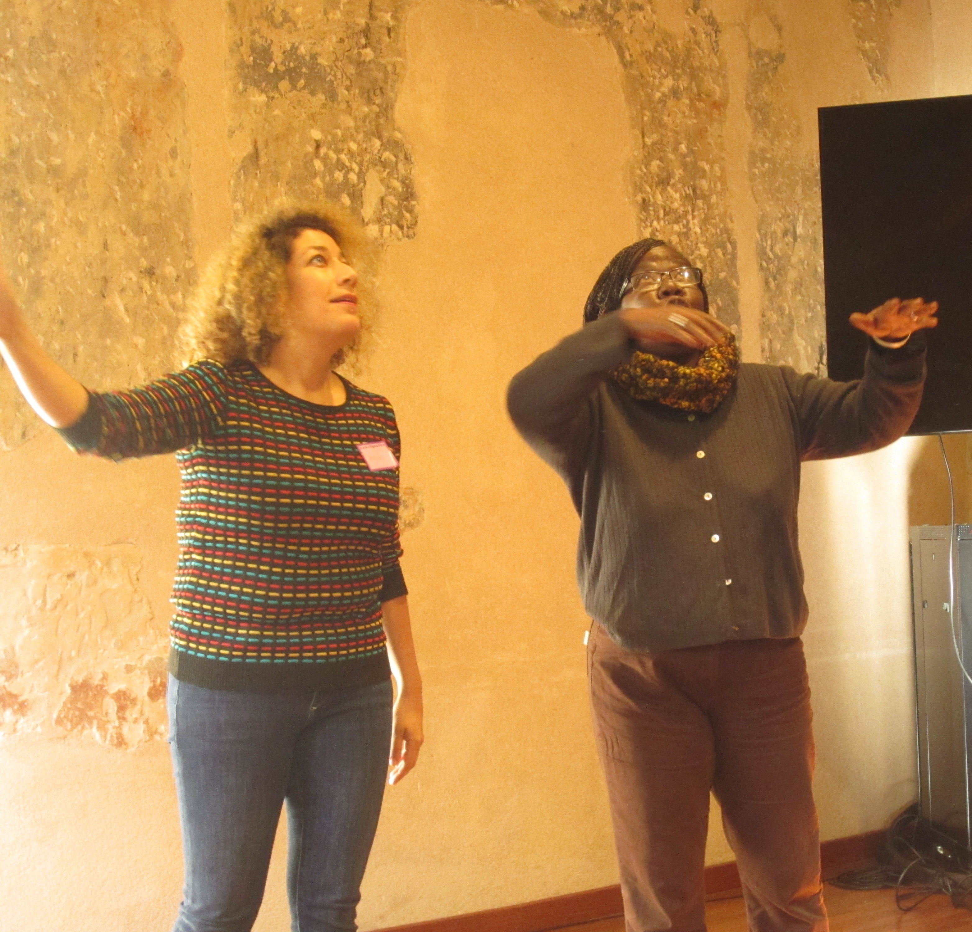 Le contre-masque est toujours efficace pour un effet comique. Deux énergies identiques donnent plus de poésie. Nous avons travaillé l’expression corporelle, la possession et l’occupation de l’espace. Les corps parlent et traduisent aussi pour faire comprendre au public. Nous avons vu comment la « chorégraphie » des déplacements peuvent nourrir l’histoire plutôt que d’enfermer l’imaginaire du public, il ne s’agit donc pas de mimer ou de répéter par le geste ou le déplacement ce qui est déjà dit. Nous avons travaillé en groupes de deux ou trois et nous est apparue la différence entre raconter la même histoire à plusieurs et en plusieurs langues et une histoire traduite par un autre narrateur, dans ce dernier cas le traducteur est au service de la narratrice. Pour arriver à une symbiose narratrice/traductrice, l’écoute est primordiale. L n’improvisation, la réactivité, la créativité en découlent.
