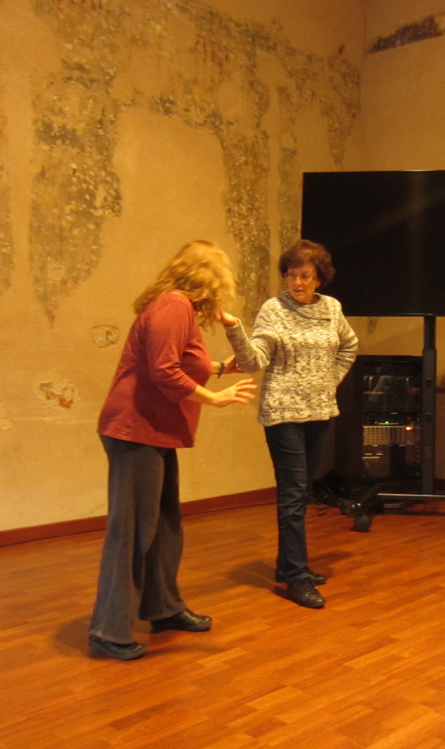 Alexandra propuso trabajar sin conocer el cuento a priori, e intentar traducirlo pese a no conocer el catalán, así que se limitaron a hablar un poco del cuento y trabajar juntas la conexión corporal. Alexandra traducía sobre la marcha, siguiendo de cerca a Rosa, moviéndose con ella por el espacio. Su actitud era realmente de estar al servicio de la narradora, quizás el ejemplo más claro de rol de traductora. Con su actitud potenciaba aún más la forma de contar de Rosa, y la refrendaba. Al no conocer la historia, hubo algunos errores de traducción que sin embargo incorporó a la narración sin problemas y dieron mucho juego al público. Reflexión: se puede jugar con las equivocaciones si no afectan demasiado a la comprensión del cuento.