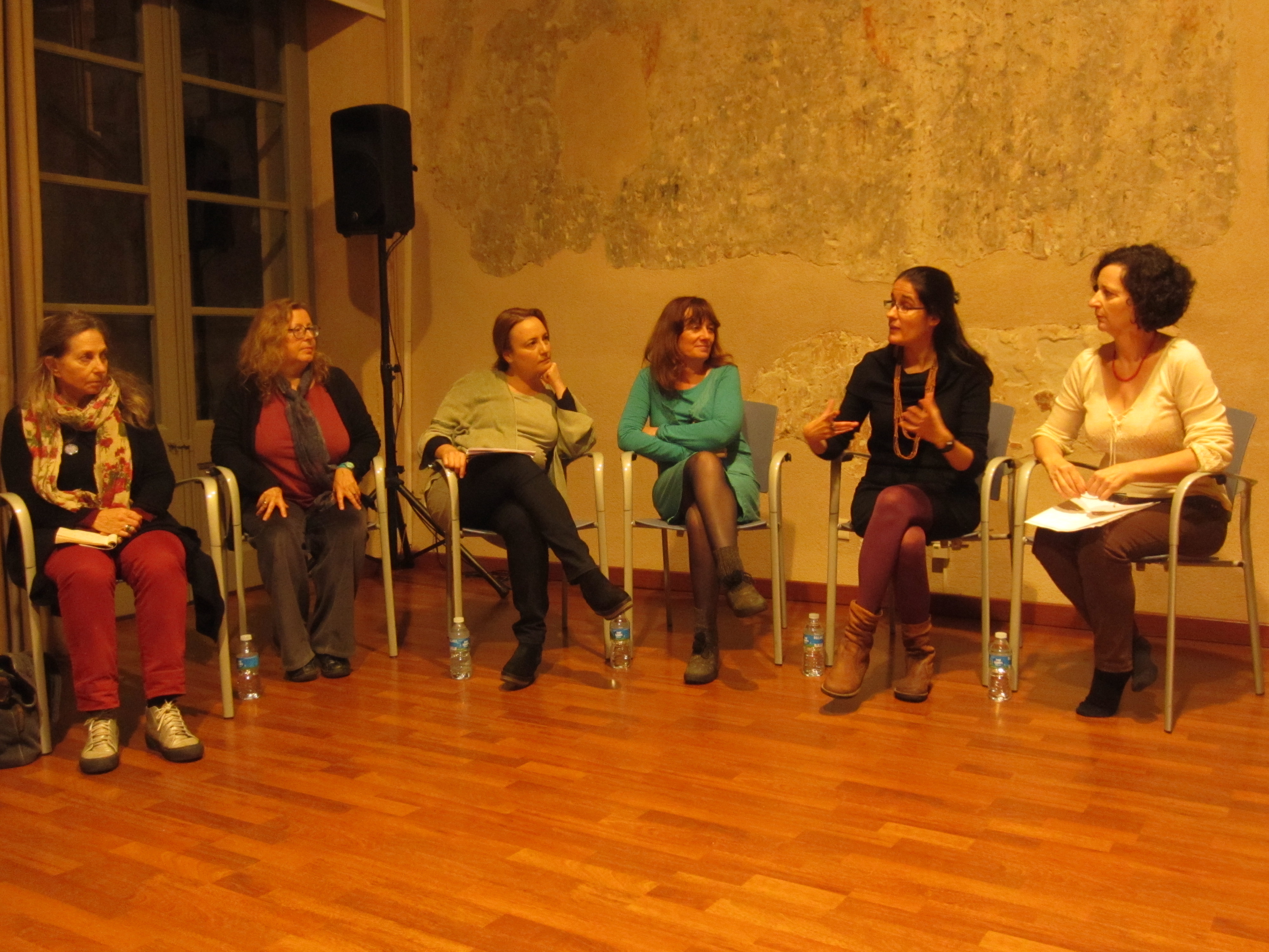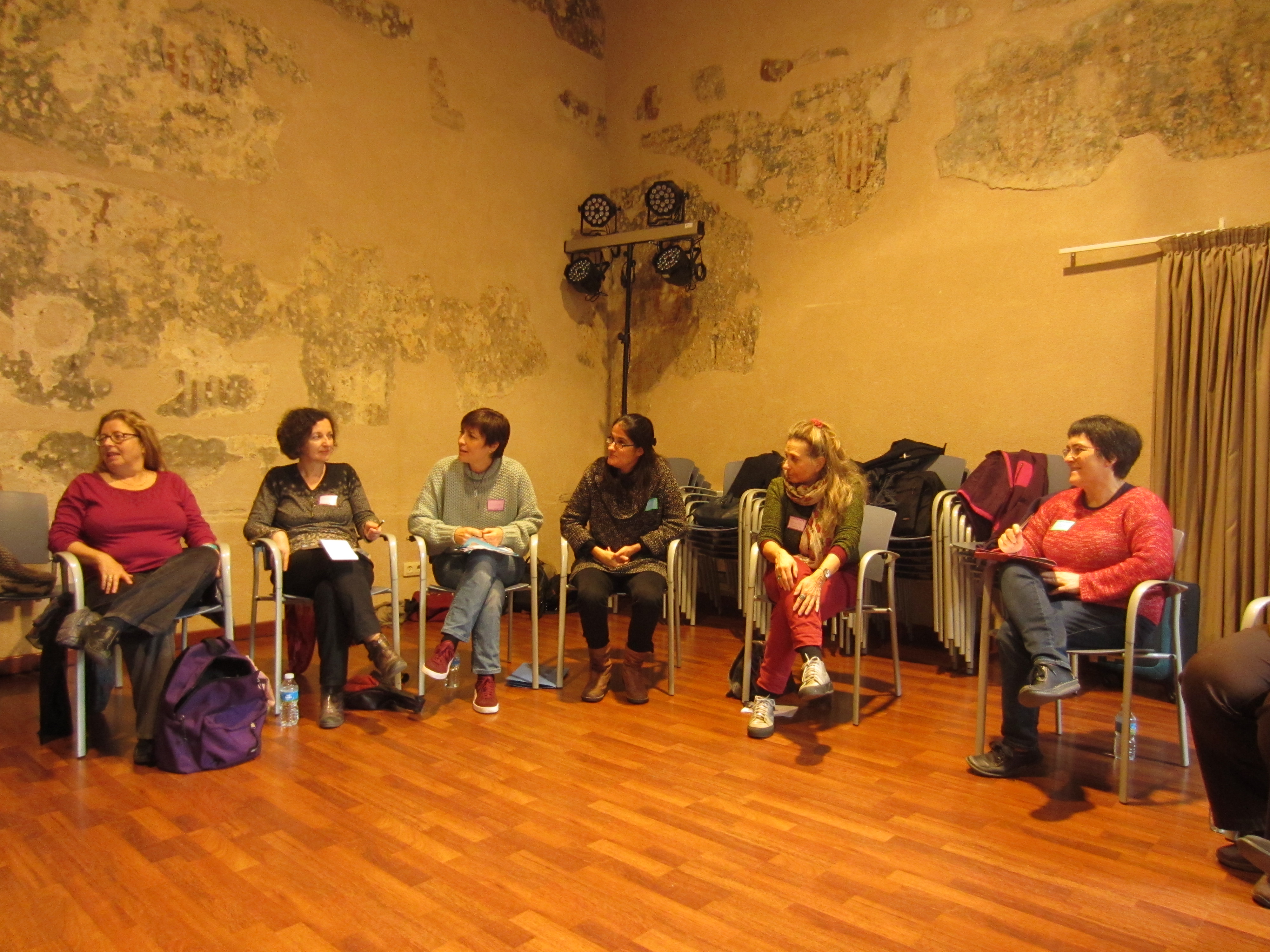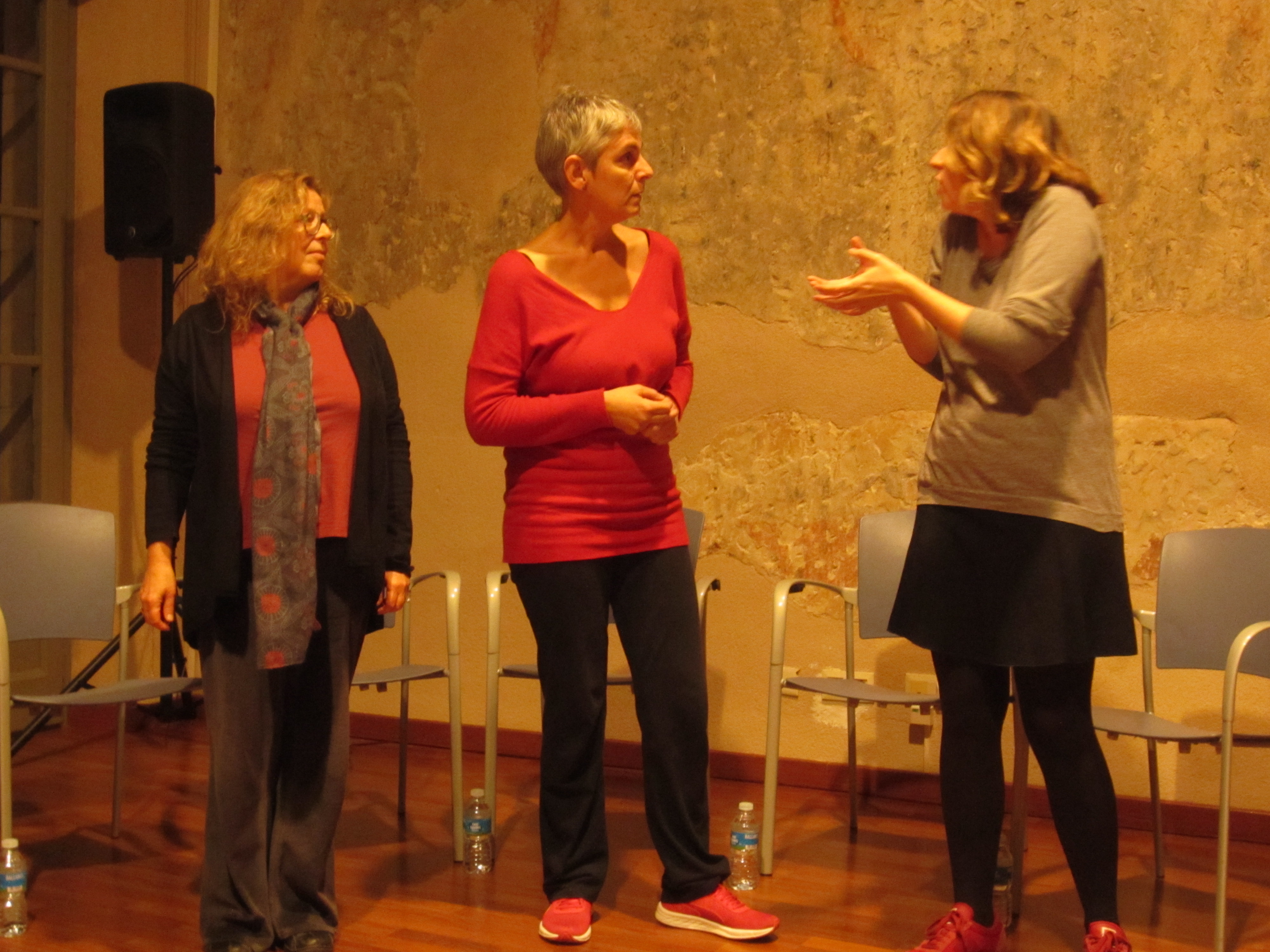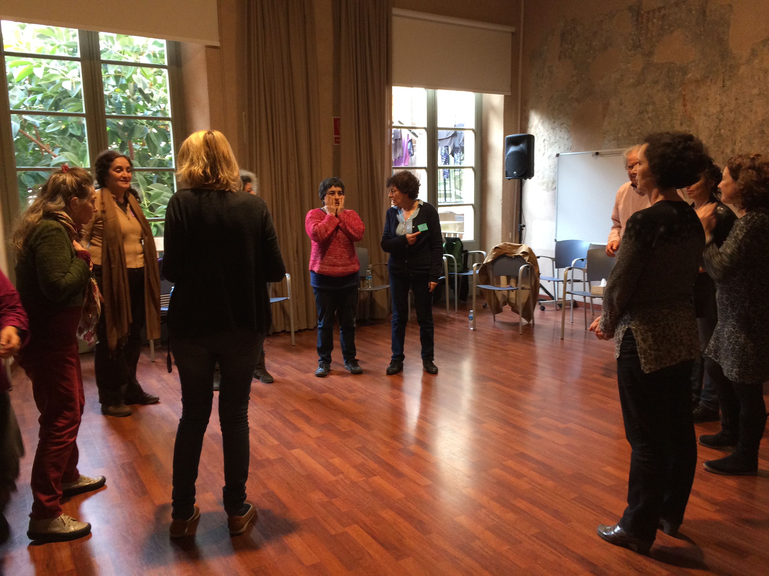 «17 participants, 10 pays représentés, 8 langues, français, arabe, gun (du Bénin), galicien, catalan, espagnol, anglais, allemand. Nous avons travaillé par groupes de deux, trois ou quatre conteuses. Nous avons travaillé dans un premier temps à effacer les rôles entre narratrices et traductrice, pour arriver à un travail artistique incluant la traduction. Nous avons ensuite présenté les travaux au reste du groupe qui a fait des retours. Nous avons terminé par une table ronde ouverte au public du centre d’animation Pati Llimona qui nous accueillait. La bienveillance de tous et tous les participants, dans l’esprit des Actes Collectifs de l’APAC, a permis aux expérimentateurs de laisser libre cours à l’exploration et des propositions très différentes ont ainsi été présentées. Nous avons questionné la position de la conteuse et celle de la traductrice, rôles clairement distribuées ou glissement de l’un à l’autre, frontière invisible. Nous avons exploré les options de jeu, comment garder l’attention du public sans perdre l’esprit et essence du conte.