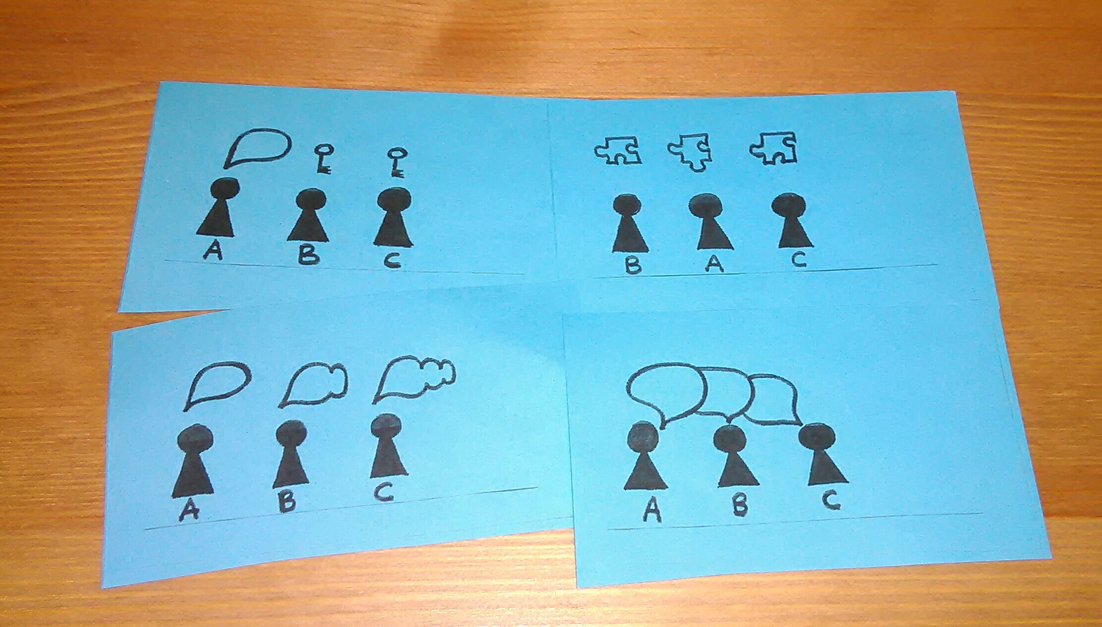 Seguramente con un trabajo más profundo se podría haber conseguido sacarle mucho más partido, o guiándolas como al grupo de la mañana. En realidad fue una mezcla de las dos propuestas, pues había mucho de narración/traducción en pareja, y no tanto de compartir la narración entre todas. Me pregunto si no sería por el hecho de ser 4 y no 3, habría que hacer más ejercicios para corroborar eso. Un punto interesante fue descubrir cómo habían utilizado las tarjetas: primero habían hecho pruebas, y luego habían mirado si coincidían con las tarjetas.