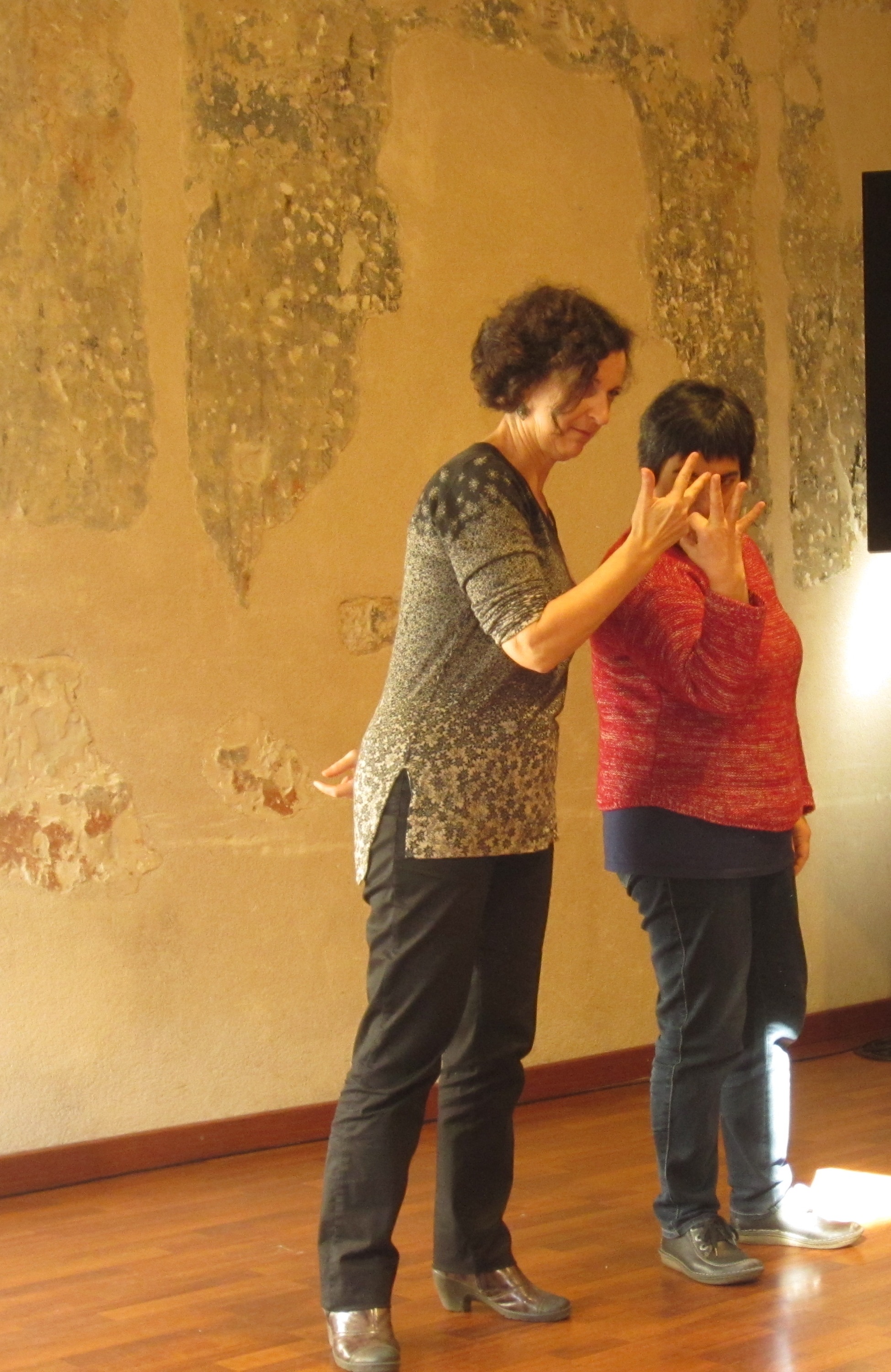 Antonietta se encargó de las parejas: empezó realizando un calentamiento basado en ejercicios corporales (respiración conjunta, contagio de movimientos, espejo…) con las parejas de narración. Su propuesta busca que un narrador adopte el papel «traductor» del otro, procurando que la traducción pase a formar parte de la propuesta de narración. La propuesta permite también el juego o intercambio de roles, aunque debe prevalecer quién toma el papel de narrador y quién el de traductor.