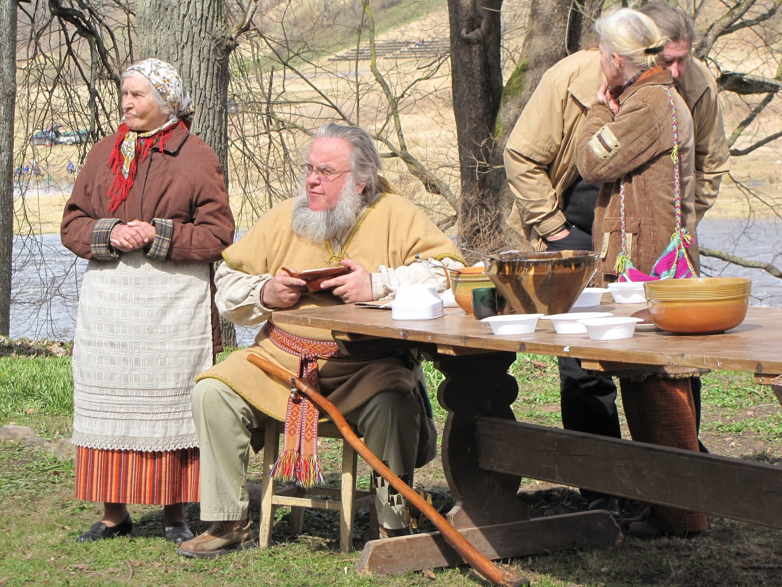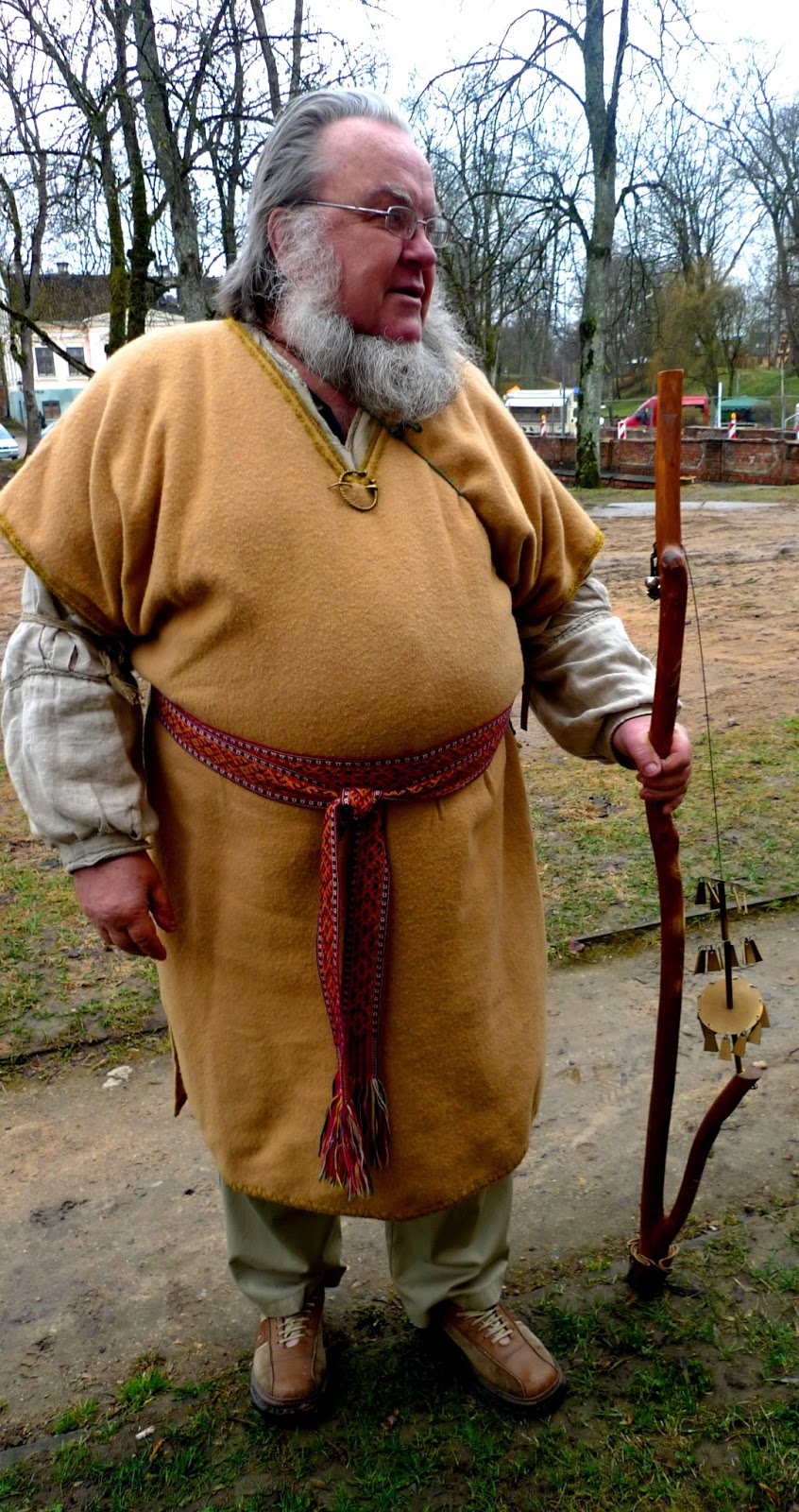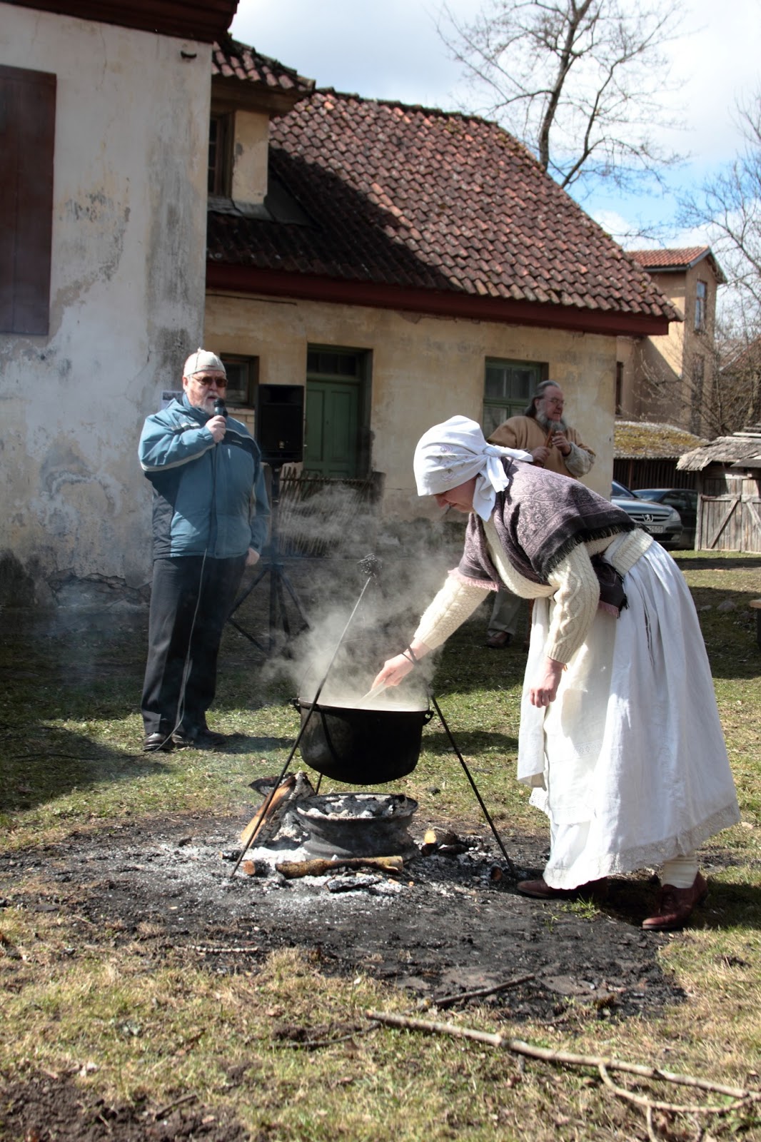 Más a la orilla, resguardado del viento por una enorme casa, se encuentra el lugar donde se desarrollará la contada, alrededor de la lumbre donde se cocinará la sopa. Liesma nos presenta a su marido Kārlis Zaķis, que ya está ocupado encendiendo el fuego. Lleva el traje tradicional y se acompaña de un ruidoso bastón con piezas de metal. «Es un bastón para ahuyentar el diablo». Es bueno saberlo. Jaak dice que en Estonia también lo tienen.