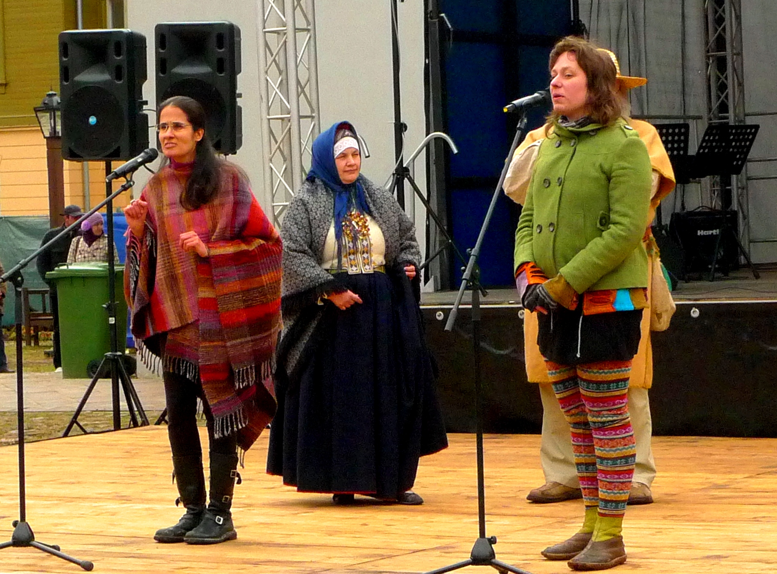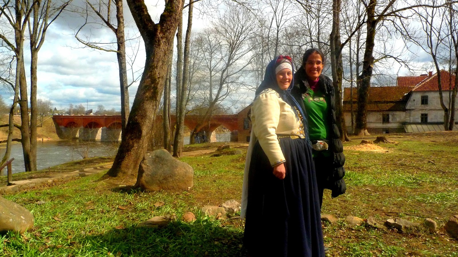 En el centro del parque han montado un gran escenario donde la gente podrá disfrutar de música, danzas… y cuentos. La feria está llena de gente paseando a pesar del frío, y agradezco enormemente poder contar con el manto que me ha prestado Mara. Por suerte, sigue sin llover. Cuando llega mi turno, cuento la sopa de piedra y en lugar de carne, le añado pescado fresco del río Venta, a la usanza del lugar. Es divertido ver como la gente va repitiendo hipnóticamente los sonidos clong-shhh-chikchikchik-chaschas-plof… Después de contar se anima a la gente para que acuda a la orilla del río, detrás del Centro Cultural Kūrava. Es un buen lugar, lejos del bullicio de la feria y a resguardo del viento, dos detalles importantes, y me alegro de ver cómo los organizadores han pensado en cosas que a veces los gestores culturales ni siquiera se plantean. Y además… ¡premio! El sol sale y la temperatura es bastante agradable.