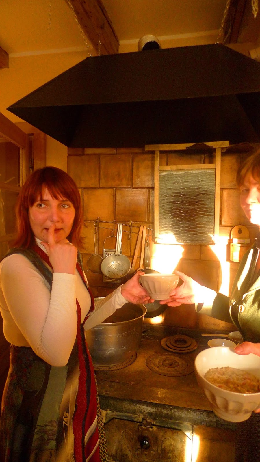 Después de los cuentos visitamos la exposición de pintura y de cine (en esta zona se rodaron algunas famosas películas durante el período soviético) y acabamos bailando bailes tradicionales. Al final subimos al taller de artesanía y comemos unas deliciosas gachas aderezadas con panceta. « ¿La bruja de los cuentos no va a venir?», pregunto, pues me he quedado con las ganas de hablar con ella: me había llamado la atención su apasionada forma de narrar y como conseguía mantener a todos los niños fascinados con sus historias. «No, no va a venir, nosotros iremos a verla a su casa». La perspectiva de visitar a una bruja en su casa es aún más fascinante.