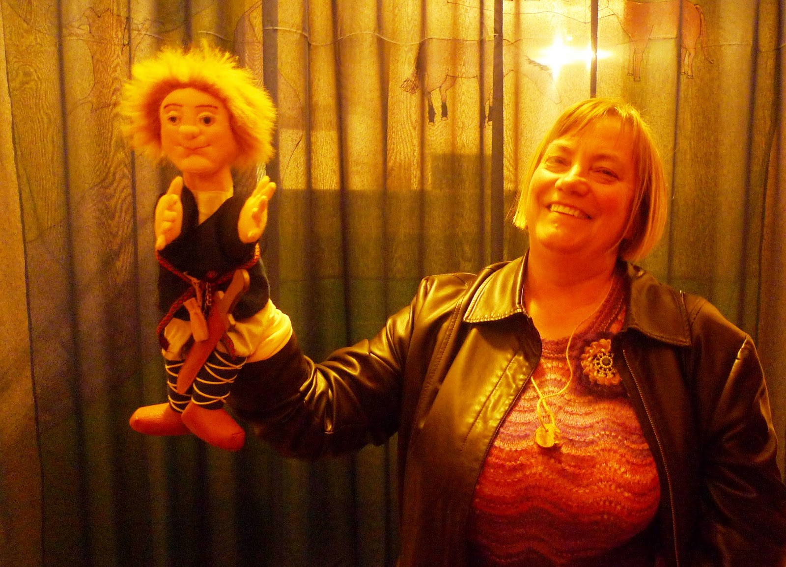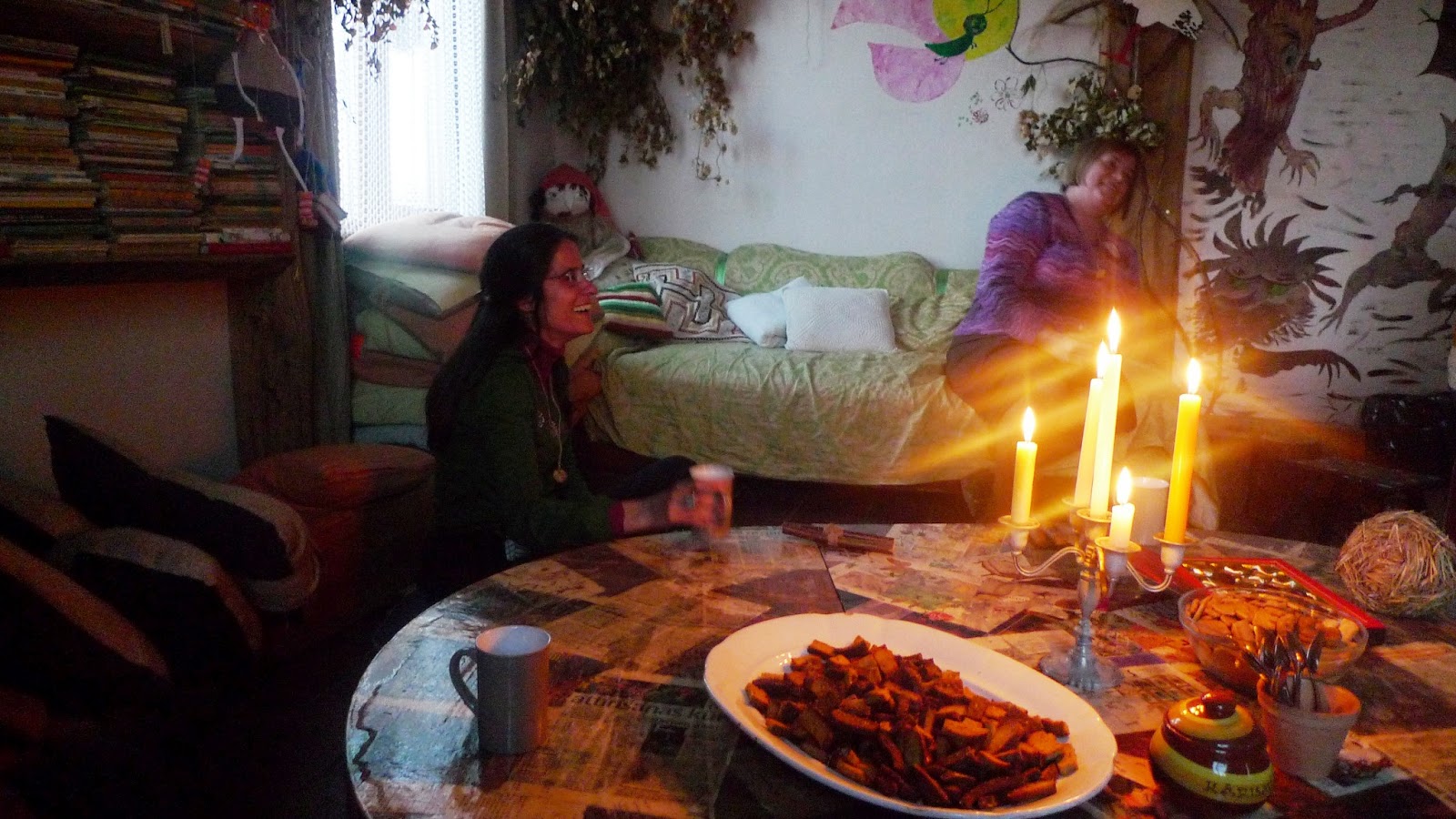 La bruja Ivita es una bruja buena. Nada más entrar nos invita a sonreír al espejo de la entrada, para dejar fuera los malos espíritus, y luego nos ofrece un té. Su marido Kārlis hace de traductor y empezamos una conversación memorable. Me habla sobre cómo prepara a la gente para la escucha, sobre su modo de ver los cuentos tradicionales… Ha desarrollado una forma muy creativa de trabajar con los niños y me encanta el universo que ha creado a su alrededor para facilitar a la gente la entrada al mundo de lo maravilloso, algo que suele resultarles más difícil a los adultos que a los niños. Soy incapaz de resumir todo lo que llegamos a hablar, desde la importancia de crear un espacio donde sea propicia la escucha, hasta el poder y el potencial de los cuentos tradicionales, nuestras formas de ver y sentir los cuentos, la tarea imposible de clasificar lo inclasificable llevada a cabo por los folkloristas… Hablamos y hablamos, y descubrimos que compartimos un lenguaje común: el de las personas que aman las historias. Ivita nos da a cada uno un talismán de madera de enebro, para librarse de la energía negativa. «Hay que guardarlo durante un año y luego quemarlo », nos aconseja la bruja.