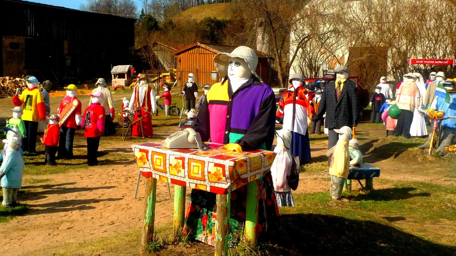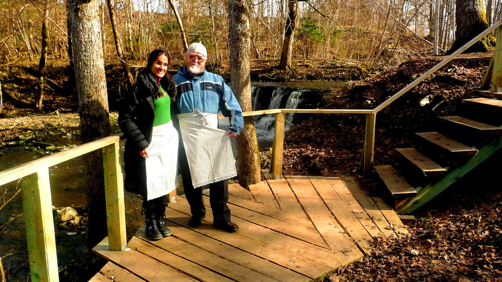Before leaving, Ina embraces us and puts around each of us an apron saying: «You are part of the family now». Hugs, farewell words… We take the car and go to Kandava, crossing forests and fields, sometimes a wooden house here and there… The country is really plain, like the Empordà, my homeland, but we do not have such beautiful forests there. Spring is coming late, but green colour begins to show up. We have time and Guntis stops to show us the Renda waterfall, and also a curious exhibition of dolls, a very curious initiative of a family from Sabile. We can see objects from the past, as an ancient ‘Riga’ washing maschine. «Everyone had one of these at home!», says Jaak.