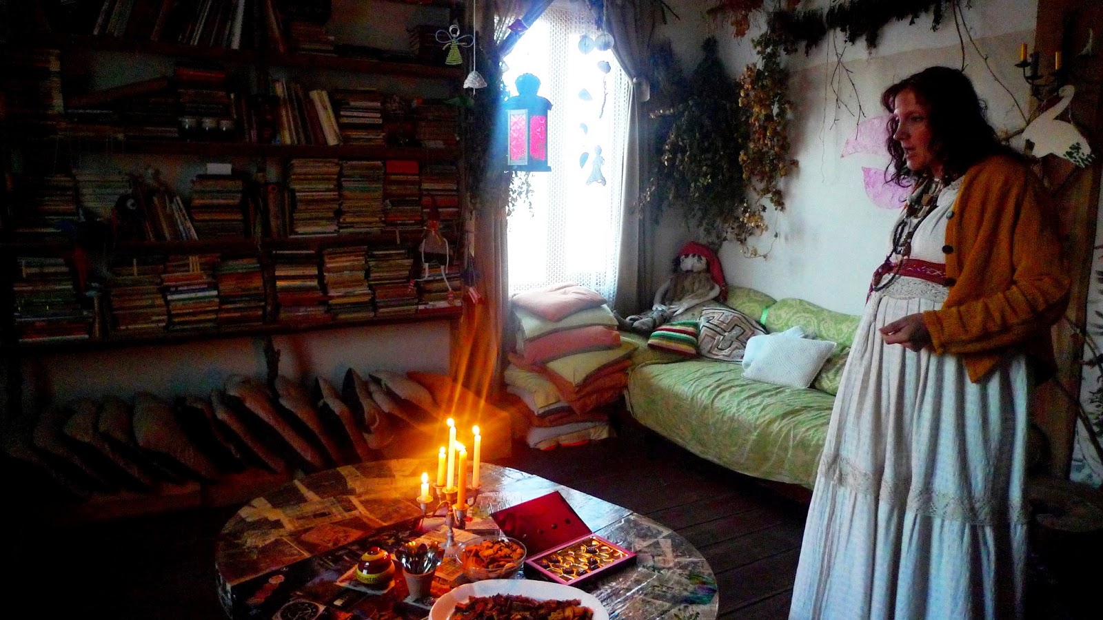 Pasaku Ragana, “la bruja de los cuentos”. Ivita ha creado un lugar original y maravilloso donde pequeños y grandes acuden a escuchar historias. Por las paredes cuelgan hierbas medicinales, en la estantería se amontonan libros de todo tipo, marionetas, muñecos y talismanes. En una pared están los tipos de cuentos que puedes elegir, y la bruja propone pequeños juegos hechos con ramas y cuerdas, y recibe a los visitantes en una sala amplia y llena de cojines, muy acogedora. En un lugar así da ganas de sentarse a escuchar historias.